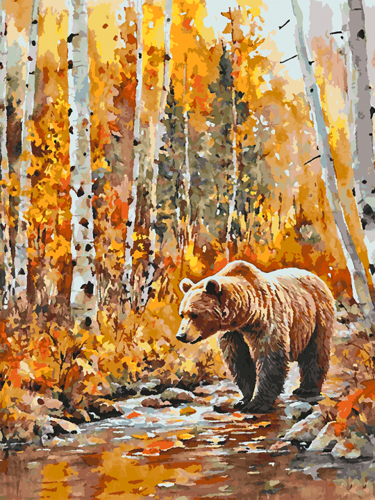 Картина по номерам на подрамнике, размер 90х70 см, произведена нами. Она включает 40 оттенков и 9086 контуров, что придаёт ей глубину цвета и плавные переходы. Картина выглядит более ярко и живо. В комплект входит глянцевый лак, которым можно покрыть работу по желанию. Краски имеют хорошую укрывистость, хватает двух проходов что бы закрасить символы на схеме. Так же они сохраняют текстуру мазков, не растекаясь и не разглаживаясь полностью на холсте. При покрытии глянцевым лаком создаётся эффект приближенный к масляной живописи. Краски упакованы герметично, что сохраняет их жидкими. Все необходимые инструменты для начала работы также включены в комплект, в том числе и крепления на стену. В картине используется крепкий подрамник со специальной вставкой, которая предотвращает провисание холста во время рисования. Это обеспечивает комфортный процесс работы и гарантирует, что холст всегда будет оставаться хорошо натянутым. Мы не используем экосольвентные чернила, которые содержат свинец и могут быть вредны для здоровья. Наши картины напечатаны безопасными водными пигментными чернилами, обеспечивающими чёткое изображение и легко читаемые обозначения. Холст плотный, имеет мелкую зернистость, легко разглаживается и устойчив к сминанию. Картина поставляется в защищённой бурой коробке. Медведь, прогуливающийся вдоль ручья в лесу, окружённом осенними деревьями с жёлтыми и оранжевыми листьями, создавая яркий и тёплый пейзаж.