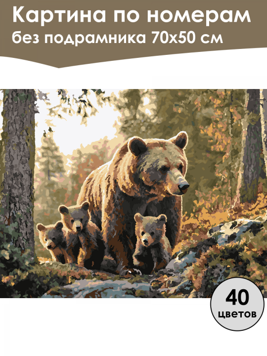 Картина по номерам без подрамника, размер 70х50 см, произведена нами. Она включает 40 оттенков и 3885 контуров, что придаёт ей глубину цвета и плавные переходы. Картина выглядит более ярко и живо. В комплект входит глянцевый лак, которым можно покрыть работу по желанию. Краски имеют хорошую укрывистость, хватает двух проходов что бы закрасить символы на схеме. Так же они сохраняют текстуру мазков, не растекаясь и не разглаживаясь полностью на холсте. При покрытии глянцевым лаком создаётся эффект приближенный к масляной живописи. Краски упакованы герметично, что сохраняет их жидкими. Все необходимые инструменты для начала работы также входят в комплект. Мы не используем экосольвентные чернила, которые содержат свинец и могут быть вредны для здоровья. Наши картины напечатаны безопасными водными пигментными чернилами, обеспечивающими чёткое изображение и легко читаемые обозначения. Холст плотный, имеет мелкую зернистость, легко разглаживается и устойчив к сминанию. Картина поставляется в бурой коробке. Следует отметить, что картина без подрамника её нельзя натянуть на подрамник из-за узких краёв, она предназначена для оформления в рамочку. Медведица с тремя медвежатами, идущая по лесу на фоне деревьев и мягкого освещения, создающего атмосферу спокойствия и природной гармонии.