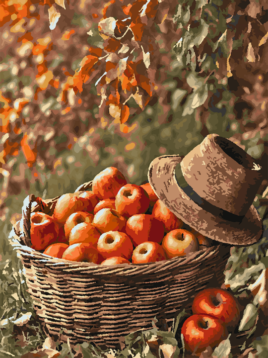 Картина по номерам на подрамнике, размер 70х50 см, произведена нами. Она включает 40 оттенков и 4279 контуров, что придаёт ей глубину цвета и плавные переходы. Картина выглядит более ярко и живо. В комплект входит глянцевый лак, которым можно покрыть работу по желанию. Краски имеют хорошую укрывистость, хватает двух проходов что бы закрасить символы на схеме. Так же они сохраняют текстуру мазков, не растекаясь и не разглаживаясь полностью на холсте. При покрытии глянцевым лаком создаётся эффект приближенный к масляной живописи. Краски упакованы герметично, что сохраняет их жидкими. Все необходимые инструменты для начала работы также включены в комплект, в том числе и крепления на стену. В картине используется крепкий подрамник со специальной вставкой, которая предотвращает провисание холста во время рисования. Это обеспечивает комфортный процесс работы и гарантирует, что холст всегда будет оставаться хорошо натянутым. Мы не используем экосольвентные чернила, которые содержат свинец и могут быть вредны для здоровья. Наши картины напечатаны безопасными водными пигментными чернилами, обеспечивающими чёткое изображение и легко читаемые обозначения. Холст плотный, имеет мелкую зернистость, легко разглаживается и устойчив к сминанию. Картина поставляется в защищённой бурой коробке. Плетёная корзина, полная ярких красных яблок, стоит на траве, освещенной теплыми осенними лучами солнца, рядом с ней лежит шляпа и несколько яблок, среди размытых красок осенней листвы на заднем плане, что создает атмосферу вечерней прогулки и сбора урожая.