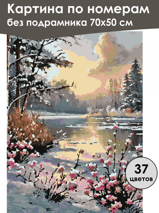 Картина по номерам без подрамника, размер 70х50 см, произведена нами. Она включает 37 оттенков и 3223 контуров, что придаёт ей глубину цвета и плавные переходы. Картина выглядит более ярко и живо. В комплект входит глянцевый лак, которым можно покрыть работу по желанию. Краски имеют хорошую укрывистость, хватает двух проходов что бы закрасить символы на схеме. Так же они сохраняют текстуру мазков, не растекаясь и не разглаживаясь полностью на холсте. При покрытии глянцевым лаком создаётся эффект приближенный к масляной живописи. Краски упакованы герметично, что сохраняет их жидкими. Все необходимые инструменты для начала работы также входят в комплект. Мы не используем экосольвентные чернила, которые содержат свинец и могут быть вредны для здоровья. Наши картины напечатаны безопасными водными пигментными чернилами, обеспечивающими чёткое изображение и легко читаемые обозначения. Холст плотный, имеет мелкую зернистость, легко разглаживается и устойчив к сминанию. Картина поставляется в бурой коробке. Следует отметить, что картина без подрамника её нельзя натянуть на подрамник из-за узких краёв, она предназначена для оформления в рамочку. Зимний пейзаж с заснеженным берегом, покрытым цветами и кустарниками, на переднем плане; деревья с заснеженными ветвями раскинулись слева, а на фоне виден замерзший водоем, отражающий теплую палитру закатного или рассветного неба с облаками, создавая контраст мягких пастельных тонов и холодных оттенков зимнего леса.