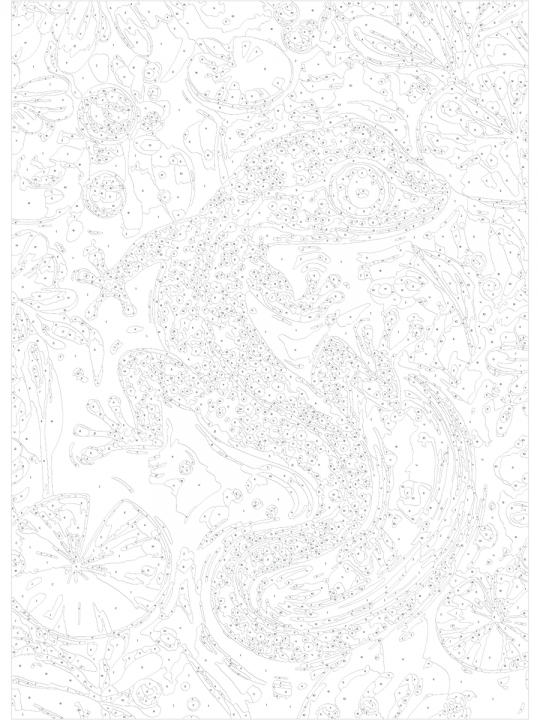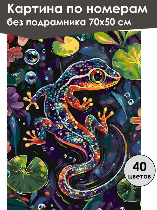 Картина по номерам без подрамника, размер 70х50 см, произведена нами. Она включает 40 оттенков и 2636 контуров, что придаёт ей глубину цвета и плавные переходы. Картина выглядит более ярко и живо. В комплект входит глянцевый лак, которым можно покрыть работу по желанию. Краски имеют хорошую укрывистость, хватает двух проходов что бы закрасить символы на схеме. Так же они сохраняют текстуру мазков, не растекаясь и не разглаживаясь полностью на холсте. При покрытии глянцевым лаком создаётся эффект приближенный к масляной живописи. Краски упакованы герметично, что сохраняет их жидкими. Все необходимые инструменты для начала работы также входят в комплект. Мы не используем экосольвентные чернила, которые содержат свинец и могут быть вредны для здоровья. Наши картины напечатаны безопасными водными пигментными чернилами, обеспечивающими чёткое изображение и легко читаемые обозначения. Холст плотный, имеет мелкую зернистость, легко разглаживается и устойчив к сминанию. Картина поставляется в бурой коробке. Следует отметить, что картина без подрамника её нельзя натянуть на подрамник из-за узких краёв, она предназначена для оформления в рамочку. Красочно стилизованная ящерица, возможно, геккона, в окружении листьев водяных лилий и пузырьков, выполненной в ярких неоновых оттенках, таких как синий, оранжевый, и фиолетовый, создающих эффект мозаики на темном фоне.