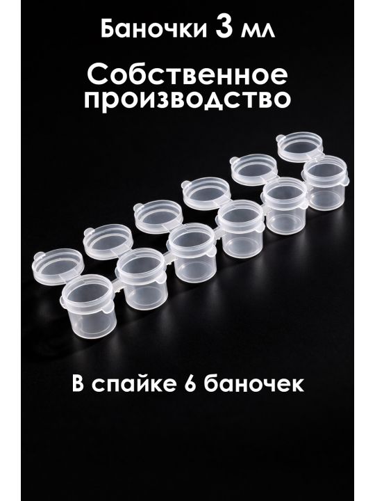 Баночки 3 мл с герметичными крышками идеальное решение для хранения красок, косметики и мелочей для творчества. Баночки соединены в удобную спайку (ленту) по 6 штук, что упрощает организацию рабочего места. Изготовлены из высококачественного первичного полипропилена прочного, безопасного и устойчивого к воздействию красок и растворителей. Благодаря герметичным крышкам содержимое не высыхает и не теряет своих свойств даже при длительном хранении, а прозрачные стенки позволяют видеть цвет или оттенок без открытия крышки, что экономит время. Баночки поставляются наборами по 500 спаек (лент) и прекрасно подойдут для художников и производителей картин по номерам, мастеров маникюра и визажистов, любителей бисероплетения, скрапбукинга и других видов рукоделия. В контейнерах удобно хранить краски, стразы, блёстки, пайетки, бисер или любые мелкие аксессуары аккуратно, красиво и надолго.