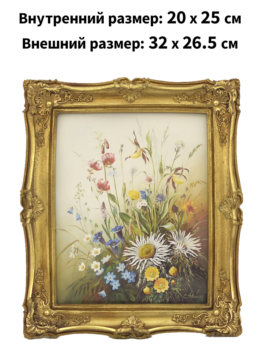 Резная багетная рамка под старину, изготовлена из гипса и покрыта патиной. Ширина багета 40 мм. Высокое качество изготовления. Доставляется в транспортировочной коробке, которая предотвращает рамку от повреждений. В комплект входит рамка, задник, стекло, крючок для подвешивания. Внутренний размер 20x25 см, внешний размер 32 x 26,5 см