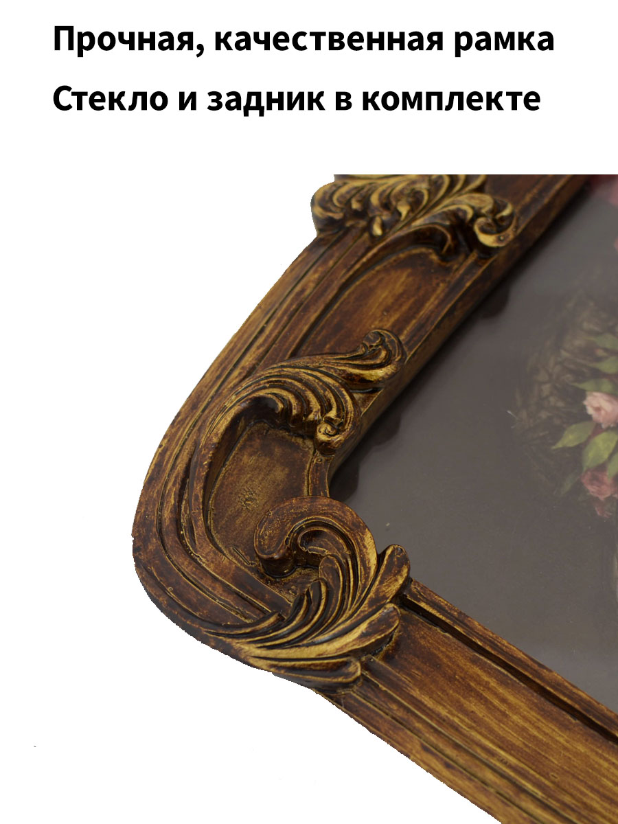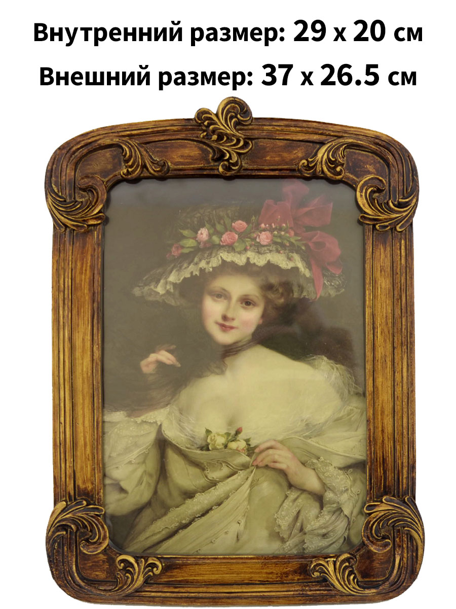 Резная багетная рамка под старину, изготовлена из гипса и покрыта патиной. Ширина багета 35 мм. Высокое качество изготовления. Доставляется в транспортировочной коробке, которая предотвращает рамку от повреждений. В комплект входит рамка, задник, стекло, крючок для подвешивания. Внутренний размер 29x20 см, внешний размер 37 x 26.5 см