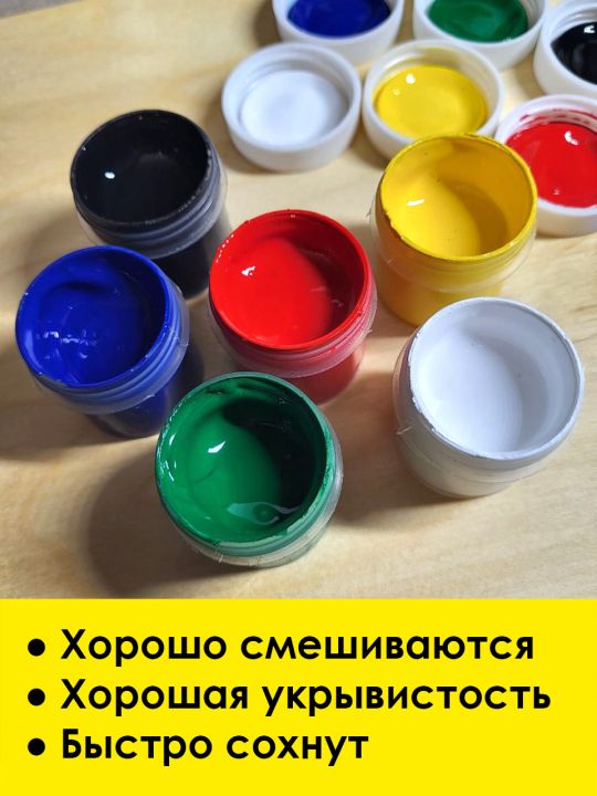 Акриловые матовые краски объёмом 20 мл., 12 разных цветов. Бренд "Кинешемская красочка", подходящие как для картин по номерам, так и для свободного творчества и живописи. Особенность наших красок в том, что они сохраняют текстуру мазков, не растекаясь и не разглаживаясь полностью на холсте. При покрытии глянцевым лаком создаётся эффект, максимально приближенный к масляной живописи. Наши краски хорошо смешиваются между собой, а так же отличаются высокой укрывистостью — закрашивают линии и цифры на холсте. Состоят из пигмента, воды и акриловой полимерной эмульсии, в качестве связующего вещества. Предназначены для лиц старше 14-ти лет.