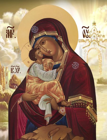 Алмазная мозаика на подрамнике «Почаевская икона Божией Матери» 70x50 см, 50 цветов