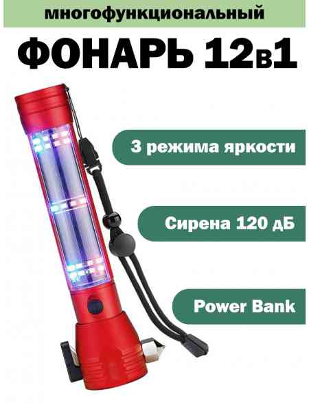 Фонарик многофункциональный светодиодный 12в1 красный
