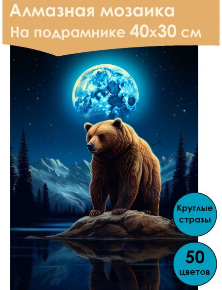 Алмазная мозаика на подрамнике «Мишка под луной» 40x30 см, 50 цветов