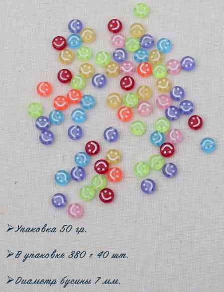 Бусины «Смайлик», цветные, диаметр 7 мм. упаковка 50 гр.