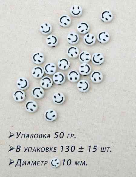 Бусины «Смайлик»,белые, диаметр 10 мм. упаковка 50 гр.
